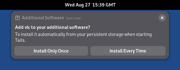 aptcommand.After the package is installed, a notification appears to ask if you want to install this package every time you start Tails in the future.